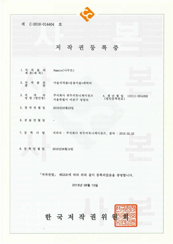 [한국/저작권] 나무트 페이지 정보 작성자 WeDu 댓글 0건 조회 4,645회 작성일 19-05-30 19:08 본문 2016-06-14 저작권 C-2016-014404 나무트 / 미술저작물>응용미술>캐릭터 List Previous[한국/저작권] 리안 19.05.30 Next[한국/저작권] 길리 19.05.30