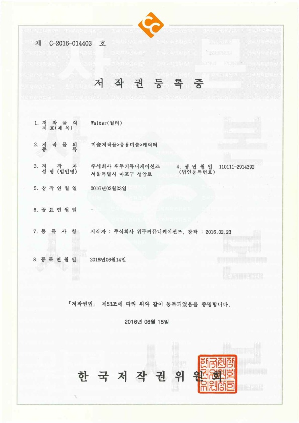 [한국/저작권] 월터 페이지 정보 작성자 WeDu 댓글 0건 조회 4,565회 작성일 19-05-30 19:09 본문 2016-06-15 저작권 C-2016-014403 월터 / 미술저작물>응용미술>캐릭터 List Previous[한국/저작권] 파벨 19.05.30 Next[한국/저작권] 필립 19.05.30