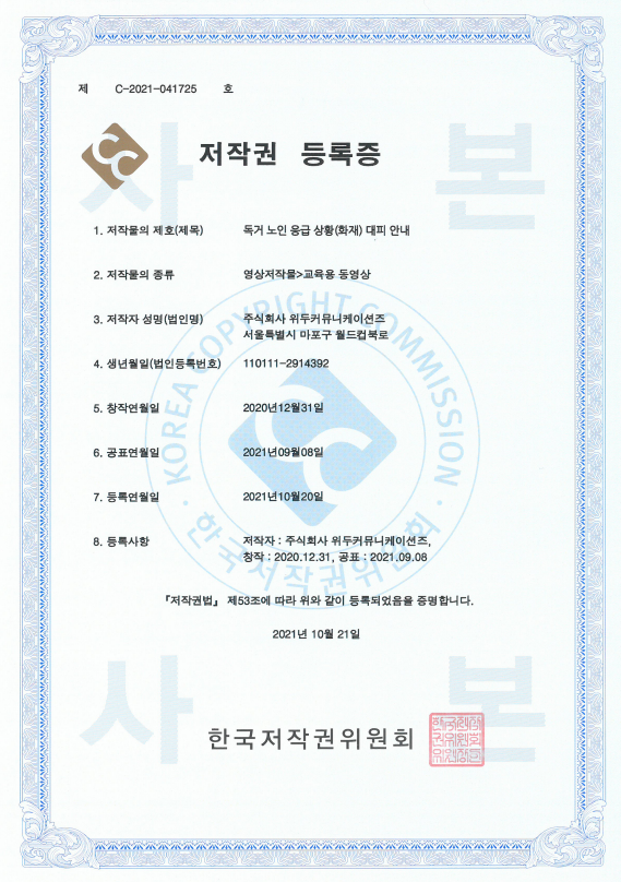 [한국/저작권] 독거 노인 응급 상황(화재) 대피 안내 페이지 정보 작성자 WeDu 댓글 0건 조회 4,676회 작성일 21-12-31 12:41 본문 2021-10-21 저작권 C-2021-041725 영상저작물>교육용 동영상 List Previous[한국/저작권] 장보기 인지훈련 게임 21.12.31 Next[한국/저작권] OLL KIDS/MATH 21.12.31